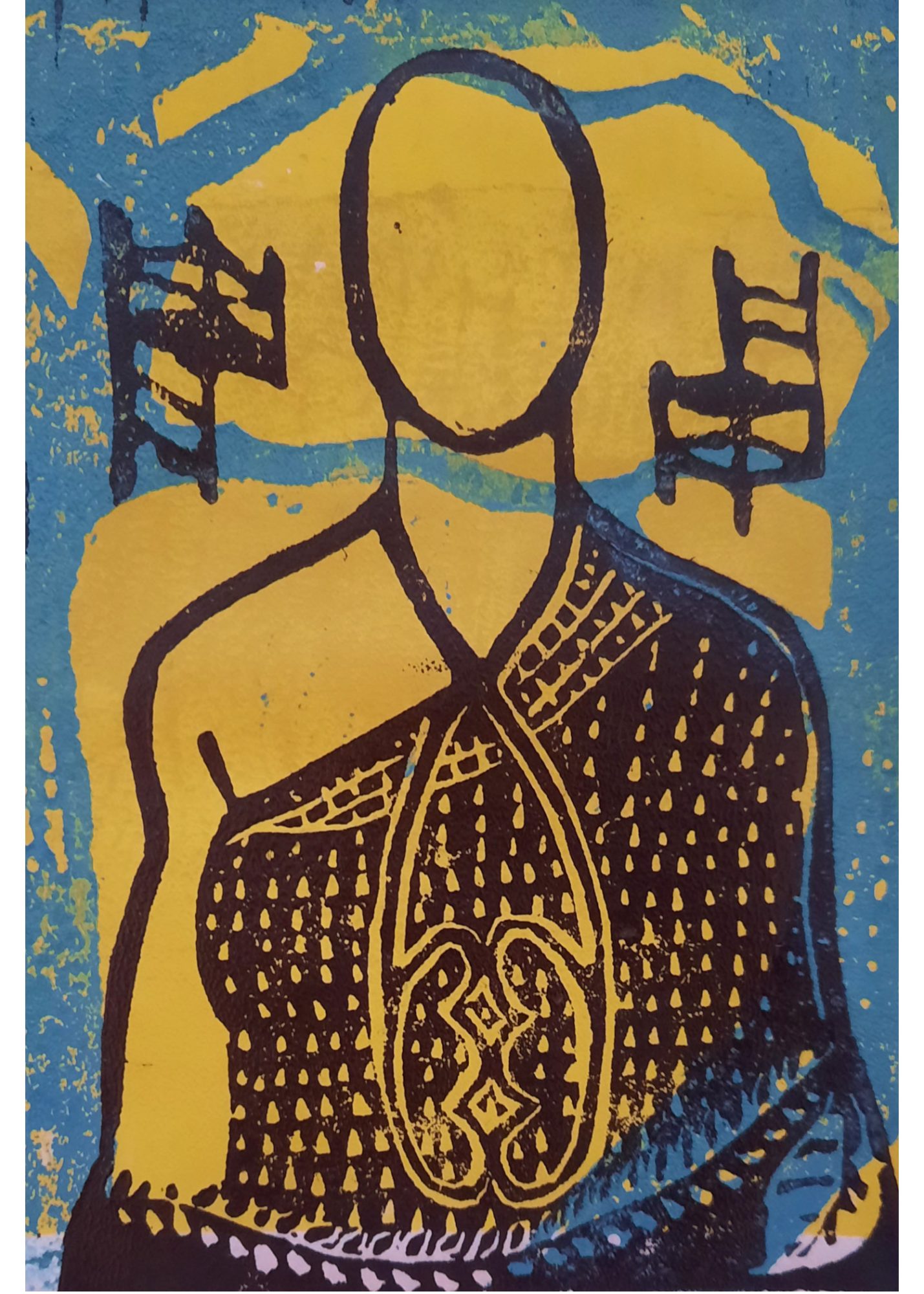 This linocut print is made up of 5 layers that I pull by hand. Each layer is a block that I carved and inked in contrasting colors, from soft hues in the background to thick richer tones in the foreground. The first layer is a field of golden light inside of which makes room for the second layer; the eye of Life (aka the third eye or pineal gland) with budding potentiality above ready to download into reality. The third layer represents the fully grown vegetation (we can also view this symbolically as the nourishment we grow from careful tending to ourselves) The fourth layer is a portal into the garden represented by two leaves overhead and the fifth layer is the being in full connection, mirroring a vibrant planet.
