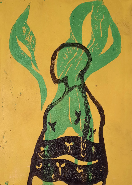 The first layer is a field of golden light. The second layer is of a fully grown plant emerging from a nourished environment. The third layer is a conscious being clothed in budding seeds and wearing a braid of their own hair as a necklace and reminder of lessons learned. From a healthy space, our potentiality is easily made manifest.